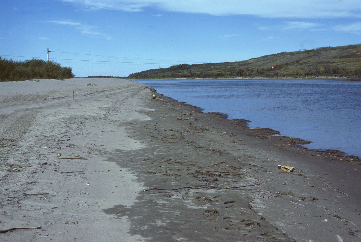 North Saskatchewan River at Paynton Ferry, on a better day (8 September 1982). The body was found a few hundred meters downstream from here.