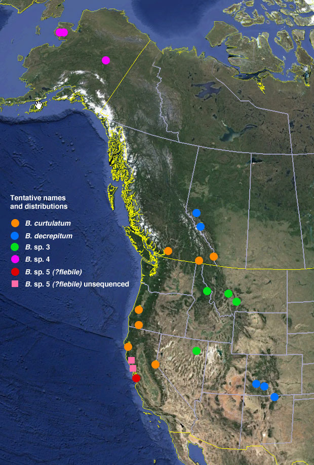 • Thank you, Paolo. I suspect you are right, that B. decrepitum and B. sp. 3 will be found to be sympatric, once we examine museum collections (first we have to find reliable ways to tell them apart morphologically) or collect more in Idaho and Montana. I also suspect that B. curtulatum will be found sympatric to those two species as well. I think there will be other pairs that may be in sympatry (e.g., B. sp. 5 and B. curtulatum). They all live along the edges of creeks and rivers, in fine gravel and sand. Those dots show only the specimens we have sequenced, and so there are a lot of specimens in collections that can fill in the gaps, and more collecting to be done for DNA-quality specimens.