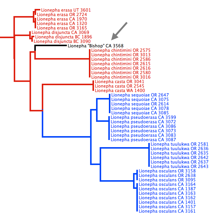 We’ve sequenced several genes from this specimen, and the answer is clear: it is not L. erasa, nor is it L. casta, and is distinct from any species we have sequenced. For example, here’s what the gene tree looks like for 28S rDNA; specimen 3568 is the one at issue.