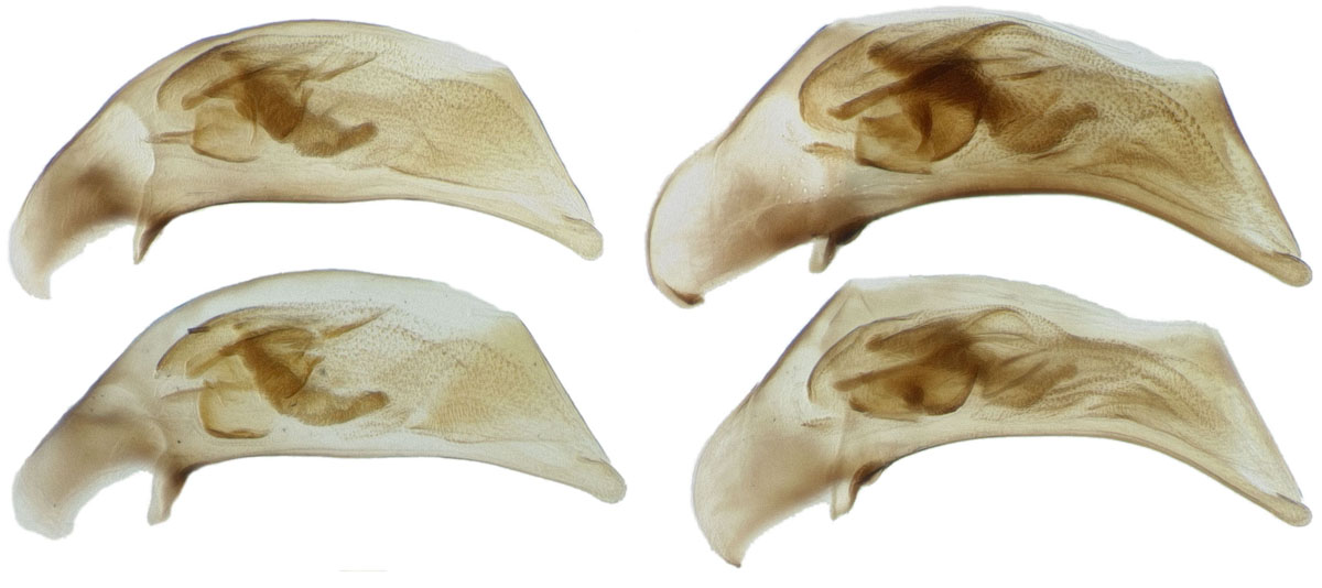 Antennal color can be difficult to determine if a specimen is not clean, or if it is old (sometimes specimens change color with age).  The male genitalia, however, are easy to tell apart.  On the left, below, are two specimens of B. wickhami #1; on the right are two specimens of B. wickhami #2.  There are many consistent differences between the two species; I’ll leave it as “an exercise for the reader” to find them. (If you click on the image below you will see a larger version, which will be easier to interpret.)