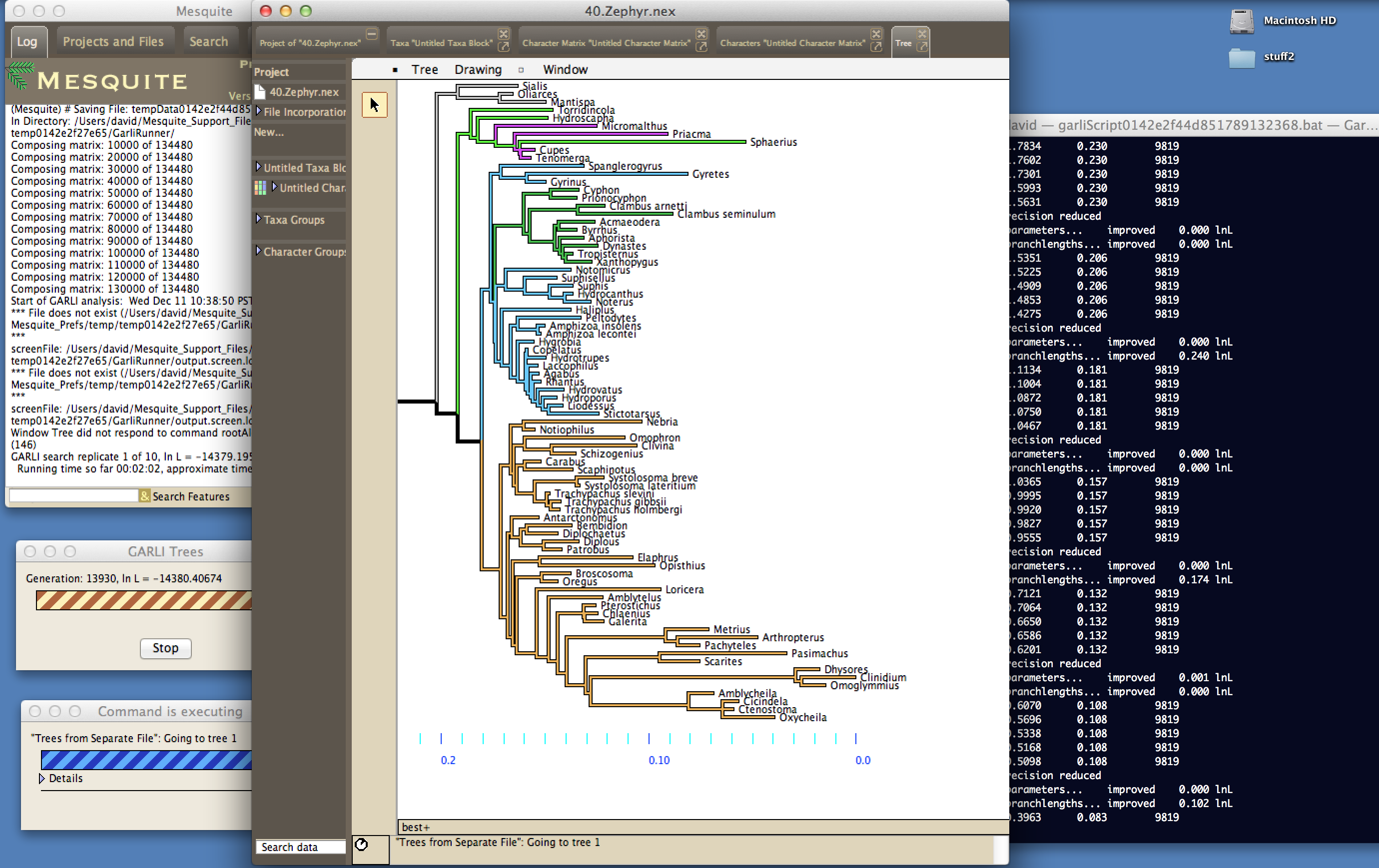 Below is a view of Mesquite with GARLI running in the background (in the black terminal window at right), and the latest GARLI tree shown in the tree window. As GARLI runs, one can watch that tree being continually adjusted. (Touch on the image below to see a larger version of it.)
