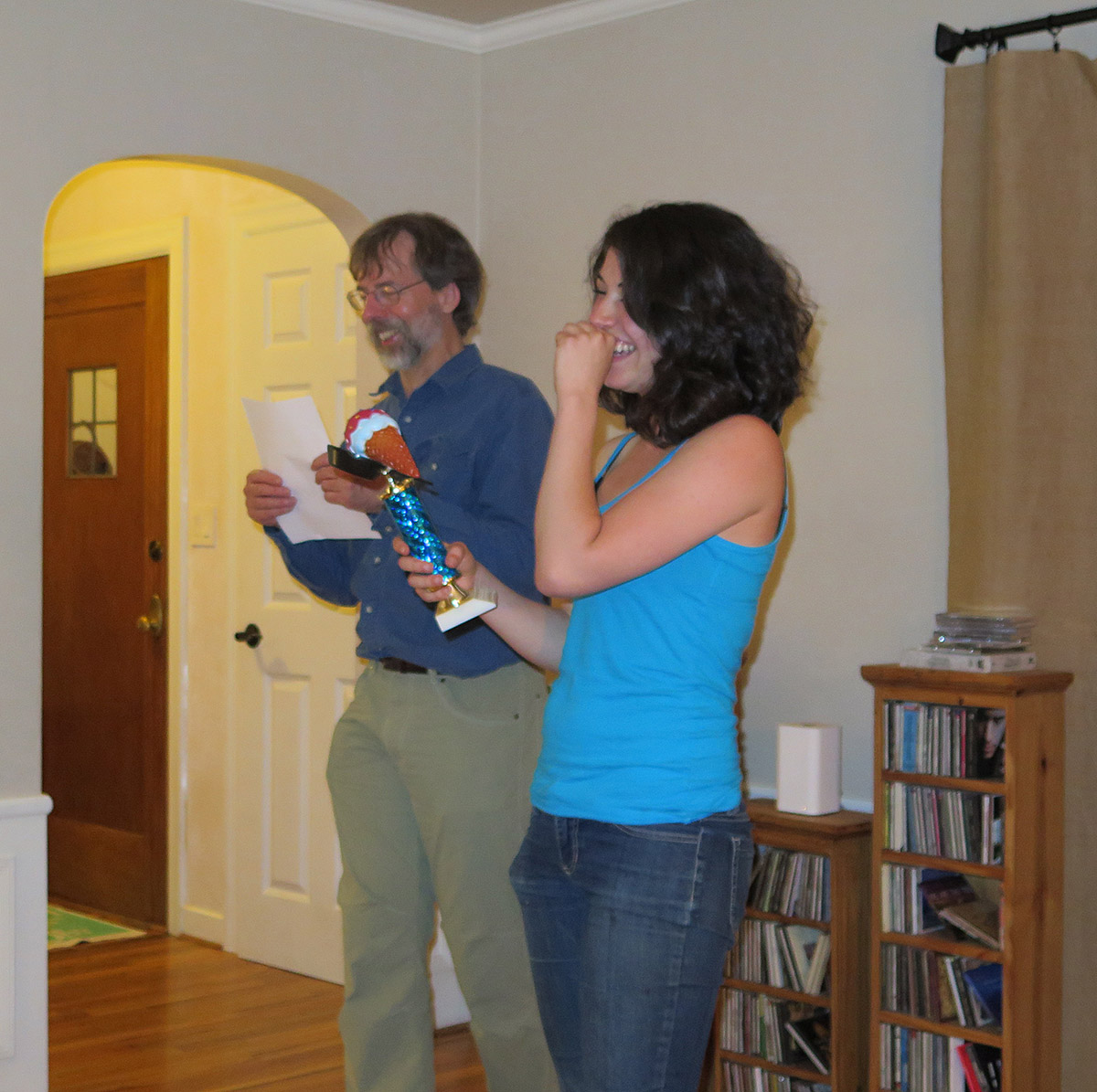 Danielle taught us the wonders of sautéing without oil during our Malheur field trip (as, well, the oil was inadvertently left in Corvallis). She was also excellent at leading us to ice cream, which the judges very much appreciated. Her award was a trophy topped with crossing items: a skillet and an ice cream cone.