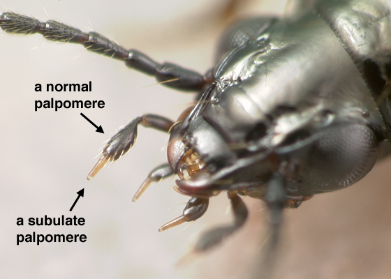 As to why it is called The Subulate Palpomere: there is a particularly cool group of beetles, the genus Bembidion and its relatives, that have subulate palpomeres, and I have loved these beetles for almost 40 years. Beetles have appendages around their mouth called “palps” that are like little feelers – the beetles use palps to handle their food, and to taste their food. A palp is made of several pieces, and each piece is called a “palpomere”. Bembidion and its relatives are unusual in that the palpomere at the end of the palps (the last palpomere) is thin and tapered – and the word used in entomology to describe such a thin and tapered palpomere is “subulate” (see picture, below).