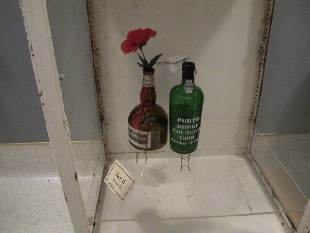 The curtain opens, and there is no one on stage, just the bottles, rose, and ladders… and a white skirt.