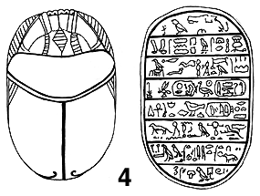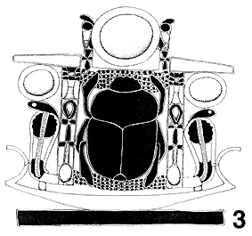The ancient Egyptians were not so obtuse as modern man; they had their priorities right. The dung beetle (Scarabaeus sacer) played an important and prominent role in their religion. The Sacred Scarab and its ball rolling behavior symbolized the sun god, Ra. After 200 B.C., during the Middle Kingdom, people believed the Sacred Scarab had magical powers that ensured rebirth after death. Consequently, its likeness was fashioned into amulets and used exclusively in jewelry (Fig. 3), in burial chambers, and in wrappings of mummies and daddies (no kidding!). Heart scarabs (Fig. 4) carved from greenstone replaced the heart inside the deceased so that the truthful heart might not incriminate its owner in the next world. These heart scarabs frequently had verse from the Egyptian Book of the Dead carved on the bottom side. The use of Scarab amulets expanded until they were used as good luck charms by the Persians, Romans, (Ratcliffe, 1980)… and some modernites like myself (hell, I’m not taking any chances!).